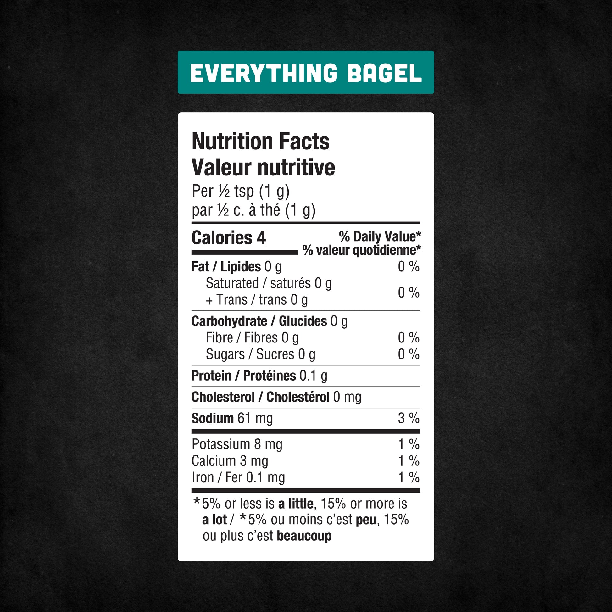 Everything Bagel: Sesame Seeds, Dehydrated onion, Salt, Dehydrated garlic, Poppy Seeds, Sunflower oil